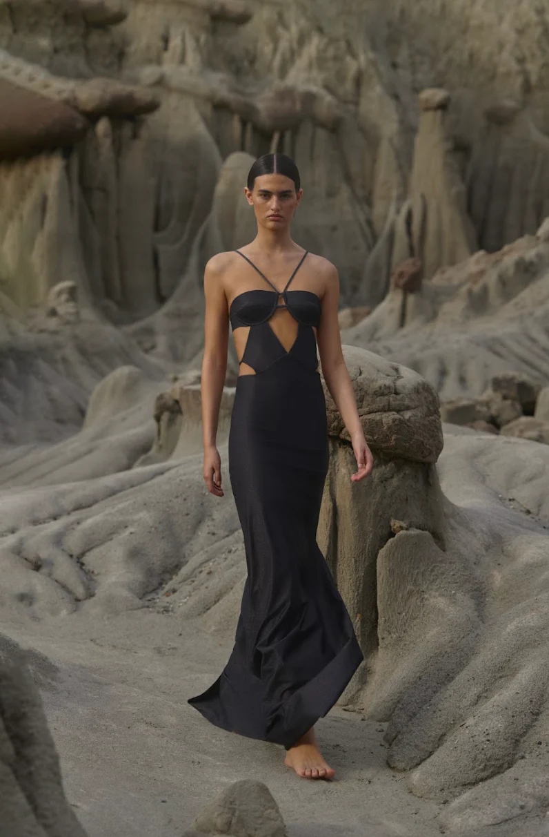 Presentamos el “Vestido Amaral” en Obsidiana – Diseñado para realzar tu colección de ropa de resort, este vestido brillante recortado eleva tus looks de la playa a la ciudad.