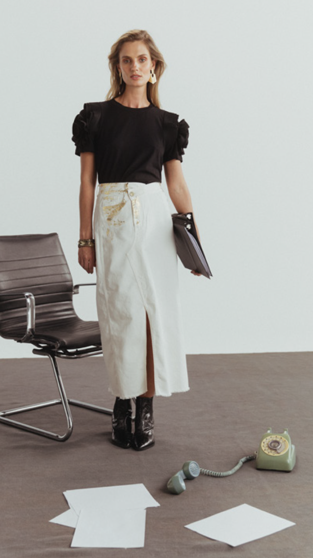 Falda asimétrica con foil para mujer con pretina cruzada.  Lavado medio con foil plata. largo midi con abertura en el centro. Corte recto y Silueta semi ajustada Un must have de temporada que llegará a complementar tus prendas infaltables en tu armario. Combínala con tenis para un look casual pero fashion o sandalias de tacón para verte más elegante y estilizada.